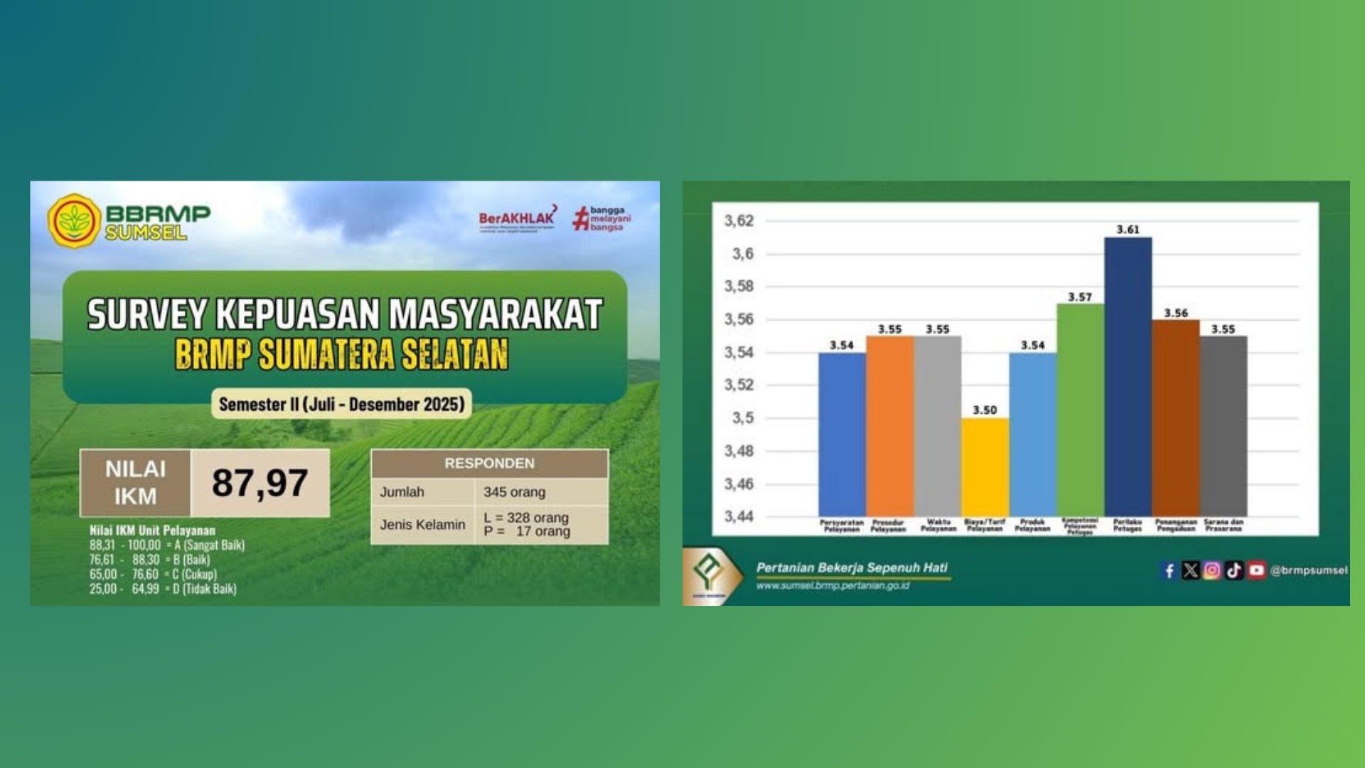 Terima kasih atas kepercayaan masyarakat. Hasil Survey Kepuasan Masyarakat BBRMP Sumsel Semester II Tahun 2025 mencapai nilai 87,97 (Sangat Baik).